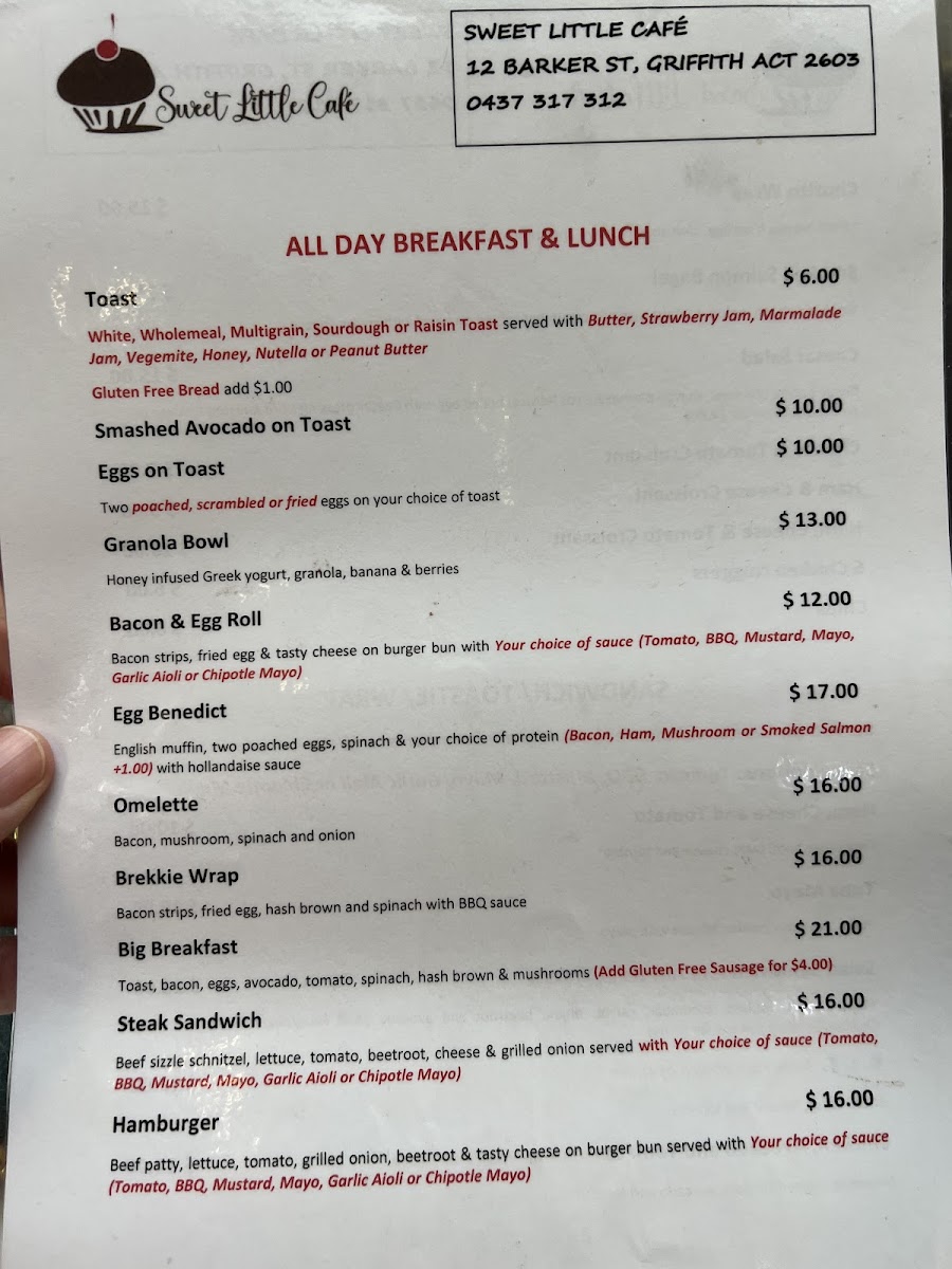 The menu at Sweet Little Cafe offers a range of breakfast and lunch options alongside classic cafe beverages. It is structured to cater to different dining preferences throughout the day, including all-day breakfast items, sandwiches, and light meals.
