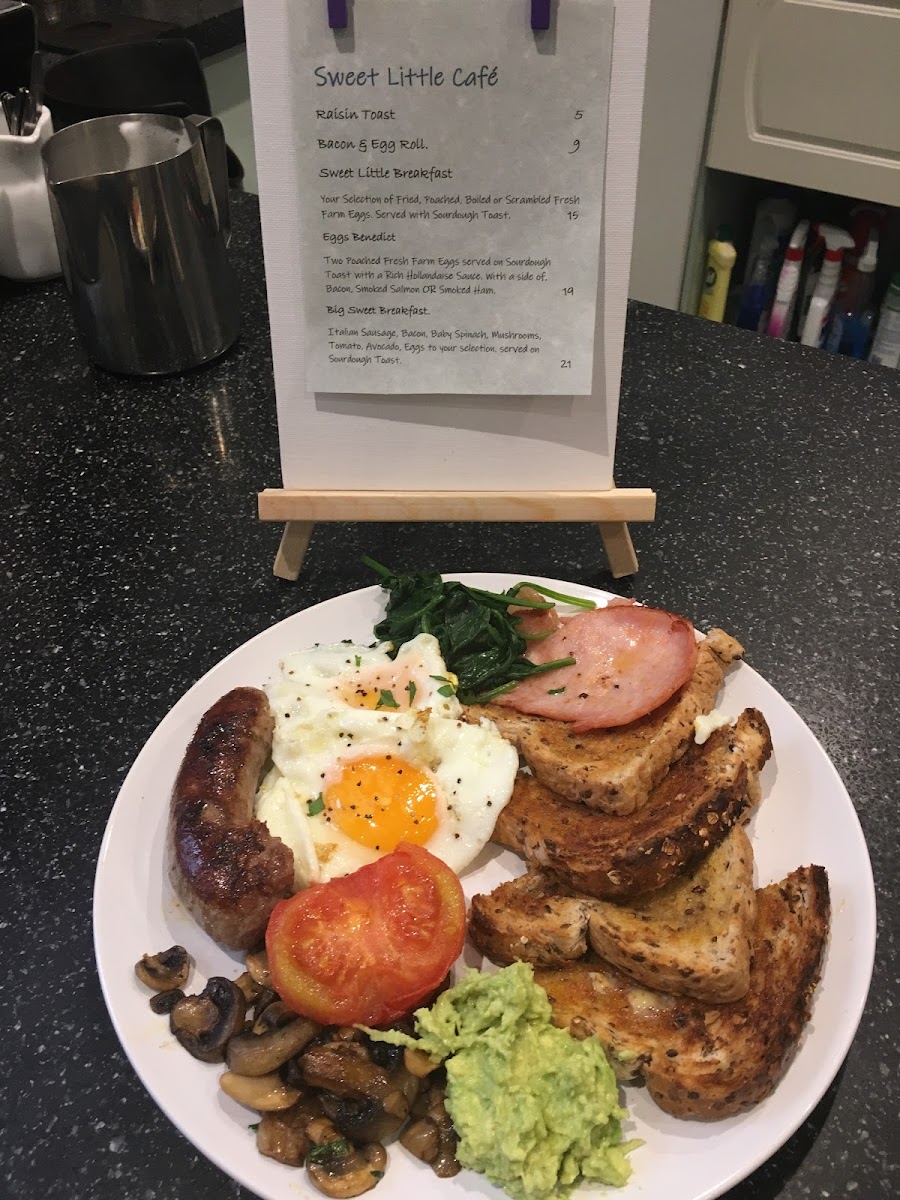 There is also a distinct section labeled Sweet Little Café which offers variations of breakfast items such as bacon & egg roll, sweet little breakfast, eggs benedict, and big sweet breakfast, providing additional choices for cafe-style meals.